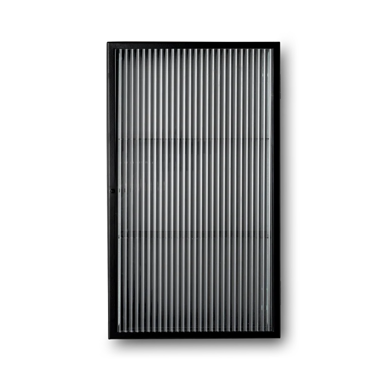 Profiling the same industrial aesthetic as the standalone Haze Vitrine, the Haze Wall Cabinet is a practical wall-mounted cabinet for storing smaller items. The powder-coated steel frame is paired with elegant reeded glass panels and door, and is the ideal solution for storing glasses in the kitchen or beauty essentials in the bathroom. It also works equally well in a hallway filled with everyday objects.