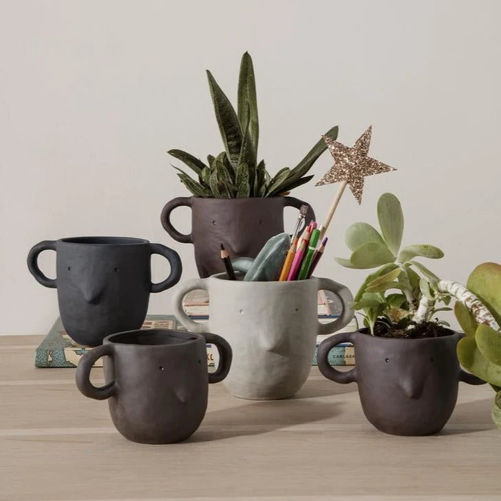 The Mus Plant Pot by ferm LIVING has a cute and homemade feeling. Being the Danish word for mouse, Mus Plant Pot is shaped like one with a pointy nose and the two handles as its ears. It has an unglazed outside and glazed inside. Available in two sizes. Colour: Red Brown / Sand Size: Large Dimensions: W: 18.5 x H: 12 x D: 10.5 cm Material: Solid colour stoneware